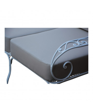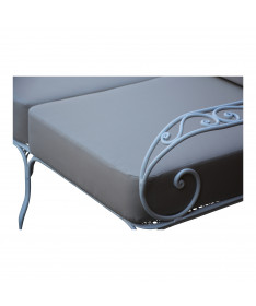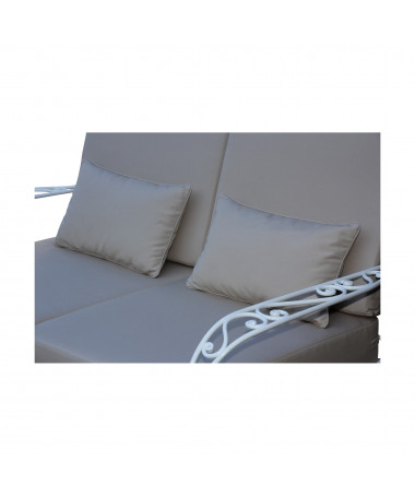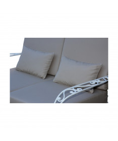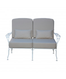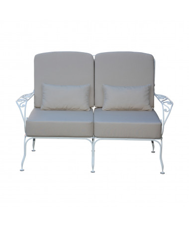 Canapé 2 places modèle "Beau-Rivage" en fer forgé peint blanc, y compris coussins beiges avec mousse hydro et tissu Sunbrella Outdoor
