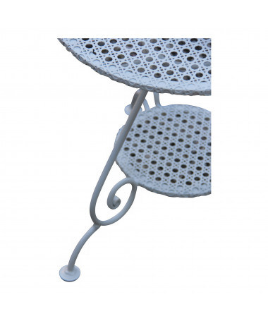 Table basse ronde modèle "Begnins" en fer forgé peint blanc, plateau et entretoise en tôle perforée type "Cannage"